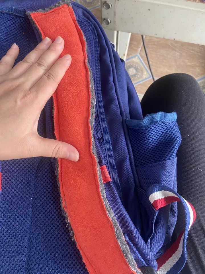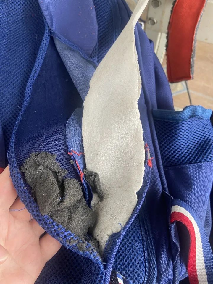 “新的时分摸起来软软的,包带也是鼓鼓的,这次拆开来一看,里边都不行了。”梅女士剪掉了儿子的一件旧背心,当成新的填充物塞了回去,“强行给他修整好了,他说还要用的。”